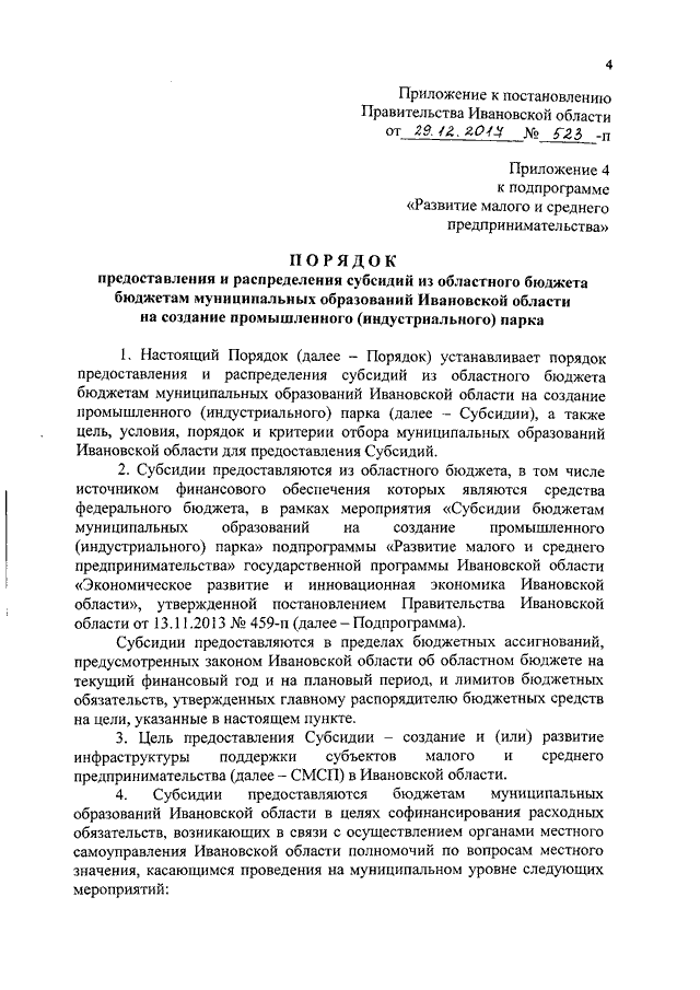 Постановление Правительства Ивановской области от 29.12.2017 N 523-п "О внесении изменений в постановление Правительства Ивановской области от 13.11.2013 N 459-п "Об утверждении государственной программы Ивановской области "Экономическое развитие и инновационная экономика Ивановской области" (вместе с "Порядком предоставления и распределения субсидий из областного бюджета бюджетам муниципальных образований Ивановской области на создание промышленного (индустриального) парка")