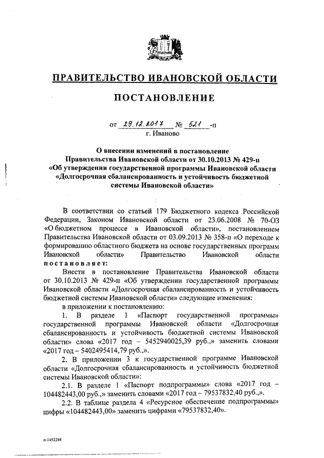 Постановление Правительства Ивановской области от 29.12.2017 N 521-п "О внесении изменений в постановление Правительства Ивановской области от 30.10.2013 N 429-п "Об утверждении государственной программы Ивановской области "Долгосрочная сбалансированность и устойчивость бюджетной системы Ивановской области"