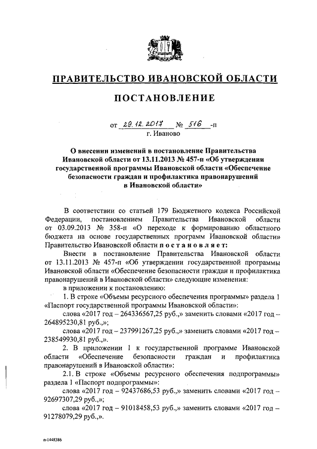 Постановление Правительства Ивановской области от 29.12.2017 N 516-п "О внесении изменений в постановление Правительства Ивановской области от 13.11.2013 N 457-п "Об утверждении государственной программы Ивановской области "Обеспечение безопасности граждан и профилактика правонарушений в Ивановской области"