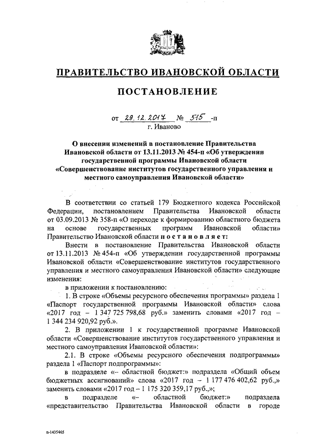 Постановление Правительства Ивановской области от 29.12.2017 N 515-п "О внесении изменений в постановление Правительства Ивановской области от 13.11.2013 N 454-п "Об утверждении государственной программы Ивановской области "Совершенствование институтов государственного управления и местного самоуправления Ивановской области"