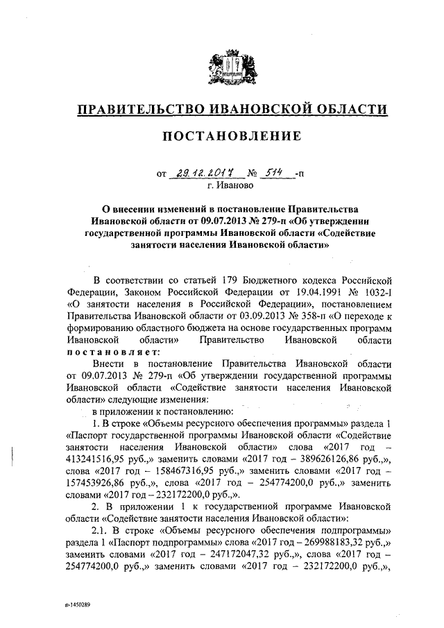 Постановление Правительства Ивановской области от 29.12.2017 N 514-п "О внесении изменений в постановление Правительства Ивановской области от 09.07.2013 N 279-п "Об утверждении государственной программы Ивановской области "Содействие занятости населения Ивановской области"