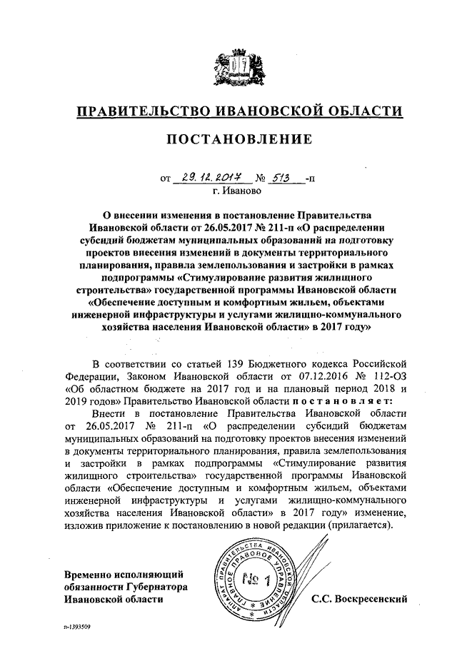 Постановление Правительства Ивановской области от 29.12.2017 N 513-п "О внесении изменения в постановление Правительства Ивановской области от 26.05.2017 N 211-п "О распределении субсидий бюджетам муниципальных образований на подготовку проектов внесения изменений в документы территориального планирования, правила землепользования и застройки в рамках подпрограммы "Стимулирование развития жилищного строительства" государственной программы Ивановской области "Обеспечение доступным и комфортным жильем, объектами инженерной инфраструктуры и услугами жилищно-коммунального хозяйства населения Ивановской области" в 2017 году"