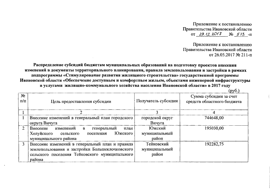 Постановление Правительства Ивановской области от 29.12.2017 N 513-п "О внесении изменения в постановление Правительства Ивановской области от 26.05.2017 N 211-п "О распределении субсидий бюджетам муниципальных образований на подготовку проектов внесения изменений в документы территориального планирования, правила землепользования и застройки в рамках подпрограммы "Стимулирование развития жилищного строительства" государственной программы Ивановской области "Обеспечение доступным и комфортным жильем, объектами инженерной инфраструктуры и услугами жилищно-коммунального хозяйства населения Ивановской области" в 2017 году"