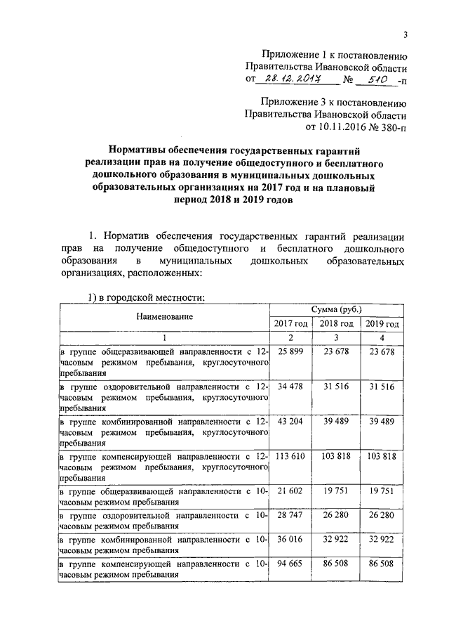 Постановление Правительства Ивановской области от 28.12.2017 N 510-п "О внесении изменений в постановление Правительства Ивановской области от 10.11.2016 N 380-п "Об утверждении нормативов обеспечения государственных гарантий реализации прав на получение общедоступного и бесплатного общего образования, обеспечения дополнительного образования в муниципальных образовательных организациях и возмещения затрат на финансовое обеспечение получения общего образования в частных образовательных организациях на 2017 год и на плановый период 2018 и 2019 годов" (вместе с "Нормативами обеспечения государственных гарантий реализации прав на получение общедоступного и бесплатного дошкольного образования в муниципальных дошкольных образовательных организациях на 2017 год и на плановый период 2018 и 2019 годов")