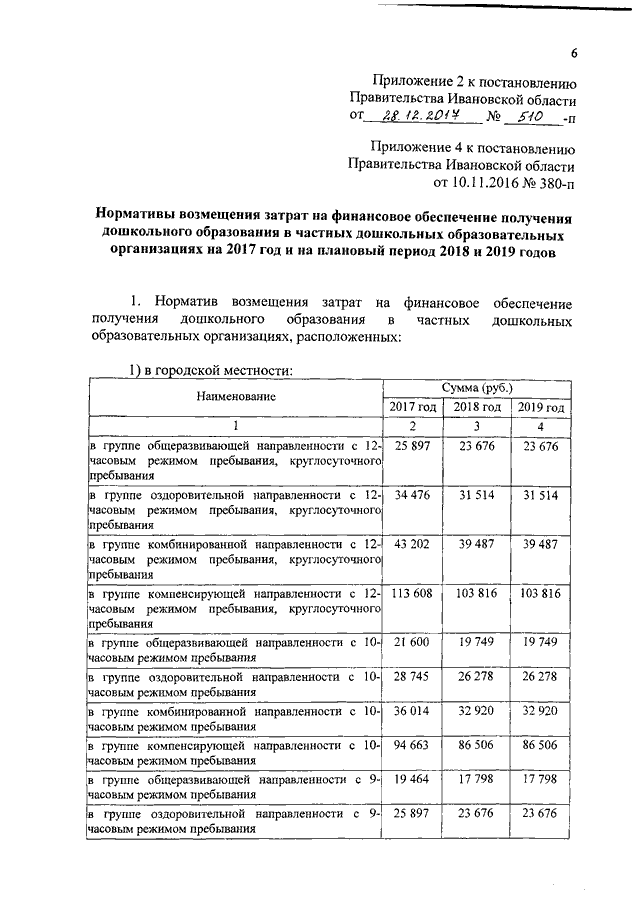 Постановление Правительства Ивановской области от 28.12.2017 N 510-п "О внесении изменений в постановление Правительства Ивановской области от 10.11.2016 N 380-п "Об утверждении нормативов обеспечения государственных гарантий реализации прав на получение общедоступного и бесплатного общего образования, обеспечения дополнительного образования в муниципальных образовательных организациях и возмещения затрат на финансовое обеспечение получения общего образования в частных образовательных организациях на 2017 год и на плановый период 2018 и 2019 годов" (вместе с "Нормативами обеспечения государственных гарантий реализации прав на получение общедоступного и бесплатного дошкольного образования в муниципальных дошкольных образовательных организациях на 2017 год и на плановый период 2018 и 2019 годов")