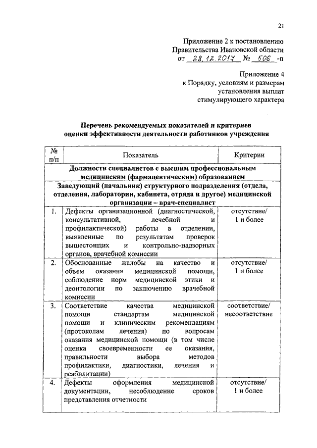 Постановление Правительства Ивановской области от 28.12.2017 N 506-п "О внесении изменений в постановление Правительства Ивановской области от 30.12.2015 N 642-п "О системе оплаты труда работников государственных учреждений Ивановской области, подведомственных Департаменту здравоохранения Ивановской области" (вместе с "Перечнем рекомендуемых показателей и критериев оценки эффективности деятельности работников учреждения")