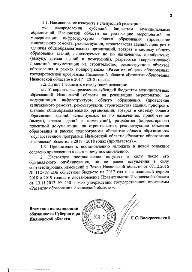 Постановление Правительства Ивановской области от 28.12.2017 N 501-п "О внесении изменений в постановление Правительства Ивановской области от 29.03.2017 N 112-п "О распределении субсидий бюджетам муниципальных районов и городских округов Ивановской области на реализацию мероприятий по модернизации инфраструктуры общего образования (проведение капитального ремонта, реконструкции, строительства зданий, пристроя к зданиям общеобразовательных организаций, возврат в систему общего образования зданий, используемых не по назначению, приобретение (выкуп), аренда зданий и помещений) в рамках подпрограммы "Развитие общего образования" государственной программы Ивановской области "Развитие образования Ивановской области" в 2017 - 2018 годах"