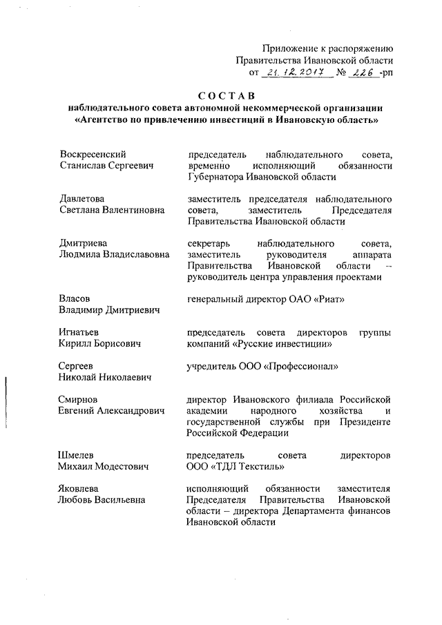 Распоряжение Правительства Ивановской области от 21.12.2017 N 226-рп "О создании наблюдательного совета автономной некоммерческой организации "Агентство по привлечению инвестиций в Ивановскую область"