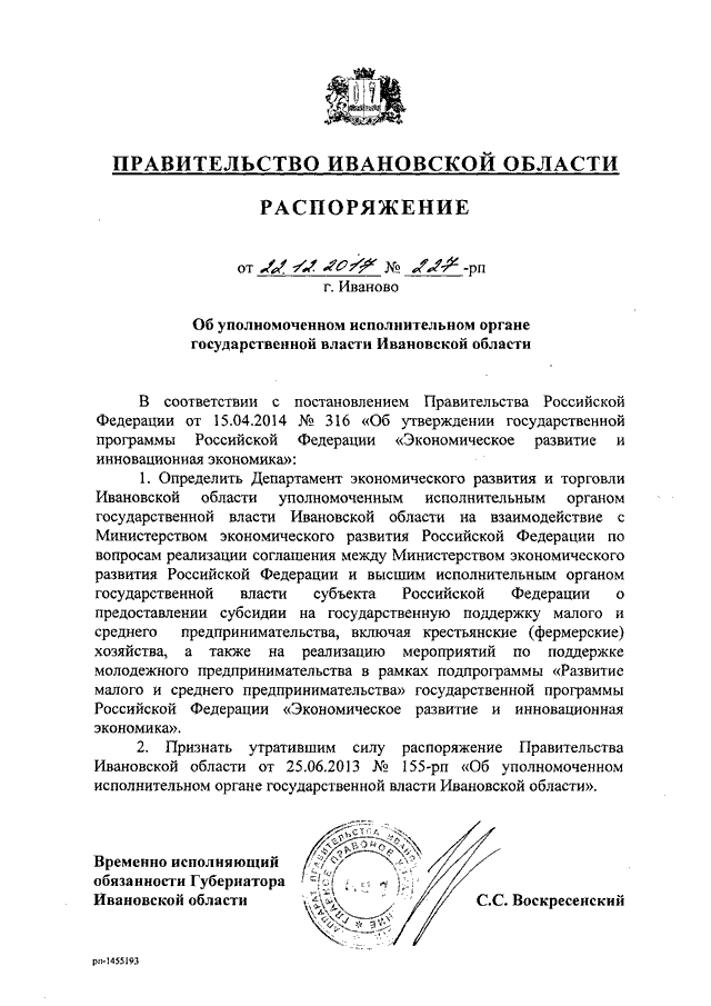Распоряжение Правительства Ивановской области от 22.12.2017 N 227-рп "Об уполномоченном исполнительном органе государственной власти Ивановской области"