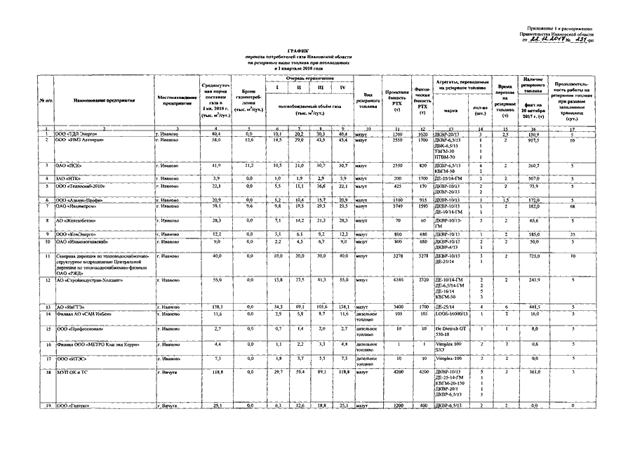 Распоряжение Правительства Ивановской области от 22.12.2017 N 231-рп "Об утверждении графиков перевода потребителей газа Ивановской области на резервные виды топлива при похолоданиях в I квартале 2018 года и ограничения снабжения газом покупателей Ивановской области и очередности их отключения в случае нарушения технологического режима работы газотранспортной системы при аварии в I квартале 2018 года"