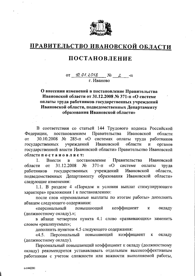 Постановление Правительства Ивановской области от 10.01.2018 N 2-п "О внесении изменений в постановление Правительства Ивановской области от 31.12.2008 N 371-п "О системе оплаты труда работников государственных учреждений Ивановской области, подведомственных Департаменту образования Ивановской области"