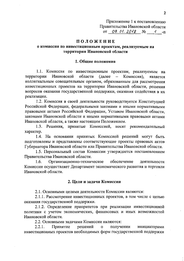 Постановление Правительства Ивановской области от 09.01.2018 N 1-п "О создании комиссии по инвестиционным проектам, реализуемым на территории Ивановской области" (вместе с "Положением о комиссии по инвестиционным проектам, реализуемым на территории Ивановской области")