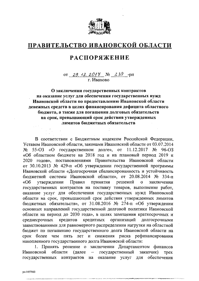 Распоряжение Правительства Ивановской области от 29.12.2017 N 239-рп "О заключении государственных контрактов на оказание услуг для обеспечения государственных нужд Ивановской области по предоставлению Ивановской области денежных средств в целях финансирования дефицита областного бюджета, а также для погашения долговых обязательств на срок, превышающий срок действия утвержденных лимитов бюджетных обязательств"