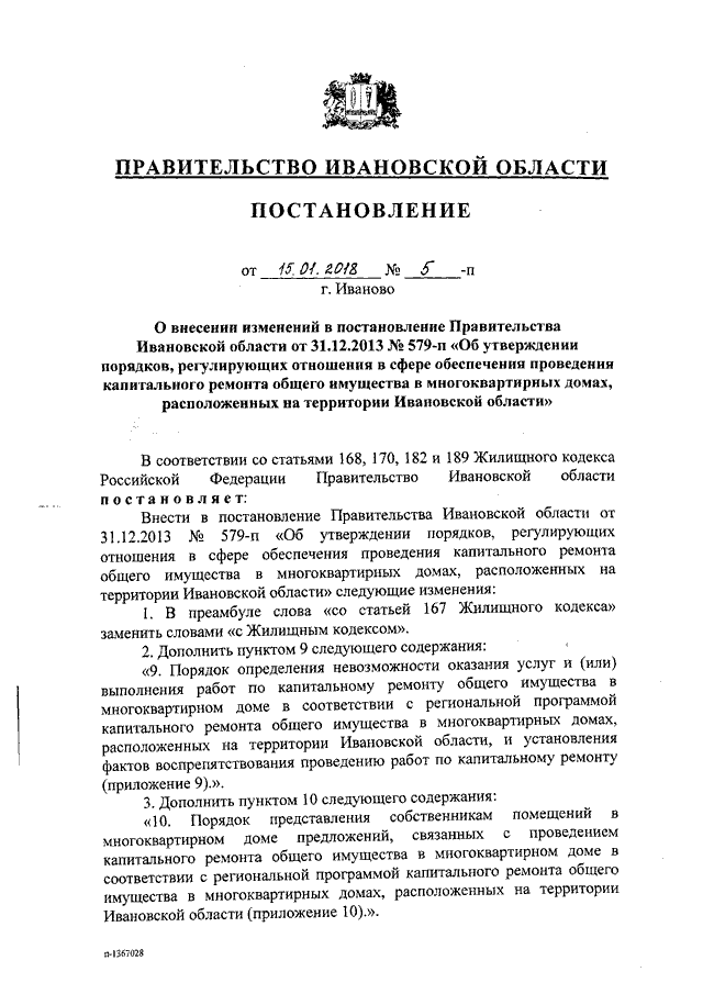 Постановление Правительства Ивановской области от 15.01.2018 N 5-п "О внесении изменений в постановление Правительства Ивановской области от 31.12.2013 N 579-п "Об утверждении порядков, регулирующих отношения в сфере обеспечения проведения капитального ремонта общего имущества в многоквартирных домах, расположенных на территории Ивановской области" (вместе с "Порядком определения невозможности оказания услуг и (или) выполнения работ по капитальному ремонту общего имущества в многоквартирном доме в соответствии с региональной программой капитального ремонта общего имущества в многоквартирных домах, расположенных на территории Ивановской области, и установления фактов воспрепятствования проведению работ по капитальному ремонту", "Порядком представления собственникам помещений в многоквартирном доме предложений, связанных с проведением капитального ремонта общего имущества в многоквартирном доме в соответствии с региональной программой капитального ремонта общего имущества в многоквартирных домах, расположенных на территории Ивановской области", "Порядком принятия решения по вопросам капитального ремонта общего имущества в многоквартирном доме в случае возникновения аварии, иных чрезвычайных ситуаций природного или техногенного характера")