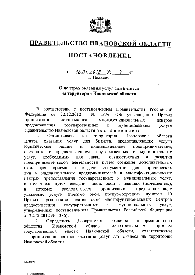 Постановление Правительства Ивановской области от 12.01.2018 N 4-п "О центрах оказания услуг для бизнеса на территории Ивановской области"