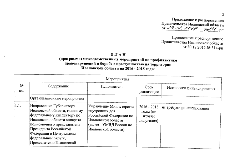 Распоряжение Правительства Ивановской области от 29.12.2017 N 240-рп "О внесении изменения в распоряжение Правительства Ивановской области от 30.12.2015 N 314-рп "Об утверждении плана (программы) межведомственных мероприятий по профилактике правонарушений и борьбе с преступностью на территории Ивановской области на 2016 - 2018 годы"