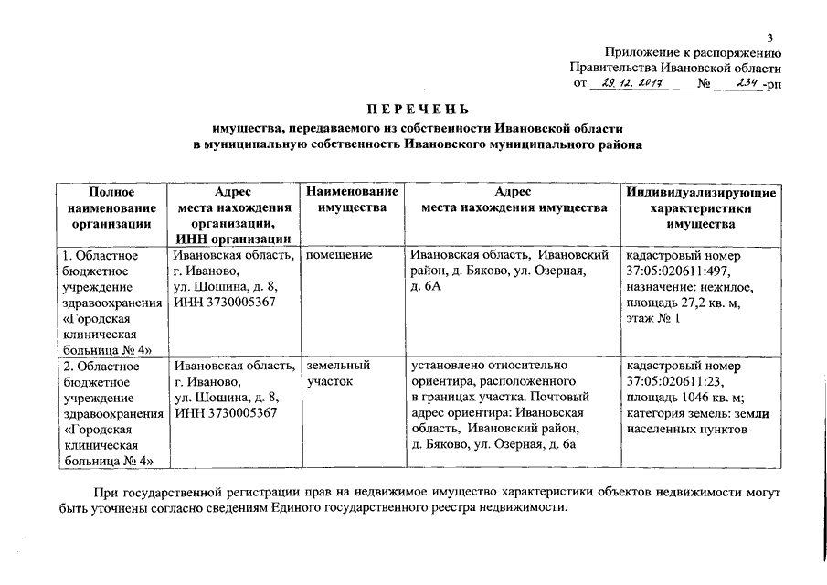 Распоряжение Правительства Ивановской области от 29.12.2017 N 234-рп "О передаче имущества из собственности Ивановской области в муниципальную собственность Ивановского муниципального района" (вместе с "Перечнем имущества, передаваемого из собственности Ивановской области в муниципальную собственность Ивановского муниципального района")
