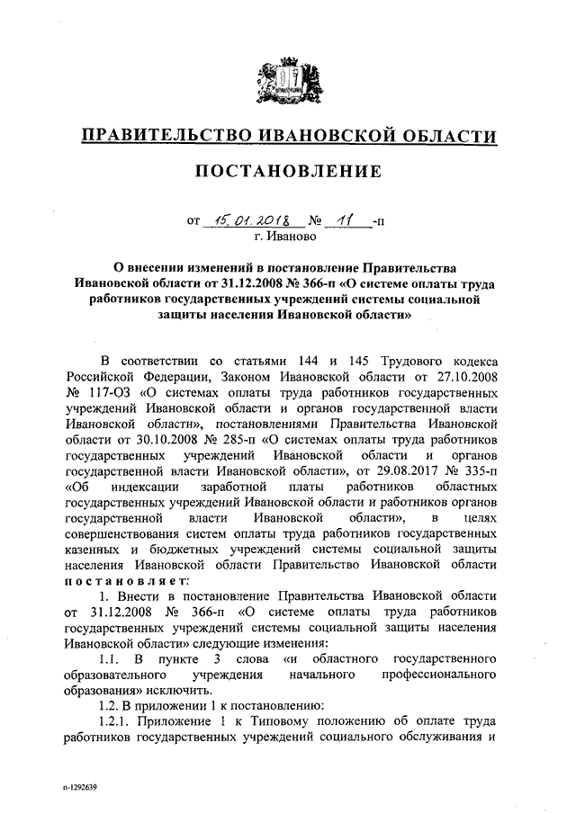 Постановление Правительства Ивановской области от 15.01.2018 N 11-п "О внесении изменений в постановление Правительства Ивановской области от 31.12.2008 N 366-п "О системе оплаты труда работников государственных учреждений системы социальной защиты населения Ивановской области" (вместе с "Перечнем профессиональных квалификационных групп должностей работников государственных учреждений системы социальной защиты населения Ивановской области", "Перечнем профессиональных квалификационных групп должностей работников государственных образовательных учреждений для детей-сирот и детей, оставшихся без попечения родителей, Ивановской области")