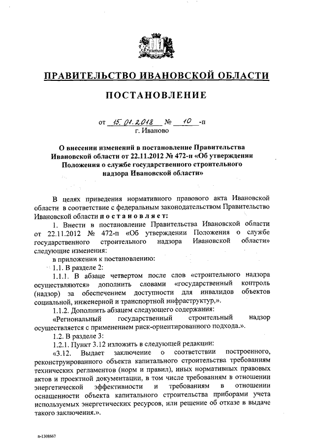 Постановление Правительства Ивановской области от 15.01.2018 N 10-п "О внесении изменений в постановление Правительства Ивановской области от 22.11.2012 N 472-п "Об утверждении Положения о службе государственного строительного надзора Ивановской области"