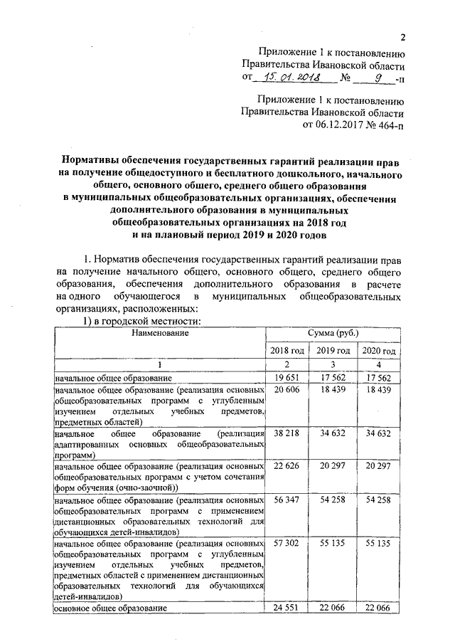 Постановление Правительства Ивановской области от 15.01.2018 N 9-п "О внесении изменений в постановление Правительства Ивановской области от 06.12.2017 N 464-п "Об утверждении нормативов обеспечения государственных гарантий реализации прав на получение общедоступного и бесплатного общего образования, обеспечения дополнительного образования в муниципальных образовательных организациях и возмещения затрат на финансовое обеспечение получения общего образования в частных образовательных организациях на 2018 год и на плановый период 2019 и 2020 годов" (вместе с "Нормативами обеспечения государственных гарантий реализации прав на получение общедоступного и бесплатного дошкольного, начального общего, основного общего, среднего общего образования в муниципальных общеобразовательных организациях, обеспечения дополнительного образования в муниципальных общеобразовательных организациях на 2018 год и на плановый период 2019 и 2020 годов", "Нормативами возмещения затрат на финансовое обеспечение получения дошкольного, начального общего, основного общего, среднего общего образования в частных общеобразовательных организациях, осуществляющих образовательную деятельность по имеющим государственную аккредитацию основным общеобразовательным программам, на 2018 год и на плановый период 2019 и 2020 годов", "Нормативами обеспечения государственных гарантий реализации прав на получение общедоступного и бесплатного дошкольного образования в муниципальных дошкольных образовательных организациях на 2018 год и на плановый период 2019 и 2020 годов", "Нормативами возмещения затрат на финансовое обеспечение получения дошкольного образования в частных дошкольных образовательных организациях на 2018 год и на плановый период 2019 и 2020 годов")
