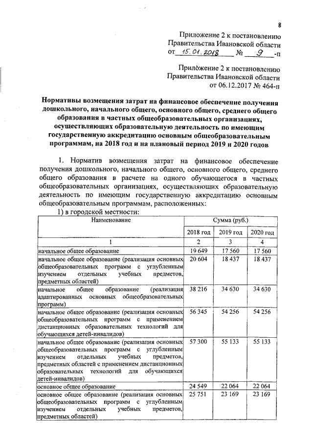 Постановление Правительства Ивановской области от 15.01.2018 N 9-п "О внесении изменений в постановление Правительства Ивановской области от 06.12.2017 N 464-п "Об утверждении нормативов обеспечения государственных гарантий реализации прав на получение общедоступного и бесплатного общего образования, обеспечения дополнительного образования в муниципальных образовательных организациях и возмещения затрат на финансовое обеспечение получения общего образования в частных образовательных организациях на 2018 год и на плановый период 2019 и 2020 годов" (вместе с "Нормативами обеспечения государственных гарантий реализации прав на получение общедоступного и бесплатного дошкольного, начального общего, основного общего, среднего общего образования в муниципальных общеобразовательных организациях, обеспечения дополнительного образования в муниципальных общеобразовательных организациях на 2018 год и на плановый период 2019 и 2020 годов", "Нормативами возмещения затрат на финансовое обеспечение получения дошкольного, начального общего, основного общего, среднего общего образования в частных общеобразовательных организациях, осуществляющих образовательную деятельность по имеющим государственную аккредитацию основным общеобразовательным программам, на 2018 год и на плановый период 2019 и 2020 годов", "Нормативами обеспечения государственных гарантий реализации прав на получение общедоступного и бесплатного дошкольного образования в муниципальных дошкольных образовательных организациях на 2018 год и на плановый период 2019 и 2020 годов", "Нормативами возмещения затрат на финансовое обеспечение получения дошкольного образования в частных дошкольных образовательных организациях на 2018 год и на плановый период 2019 и 2020 годов")
