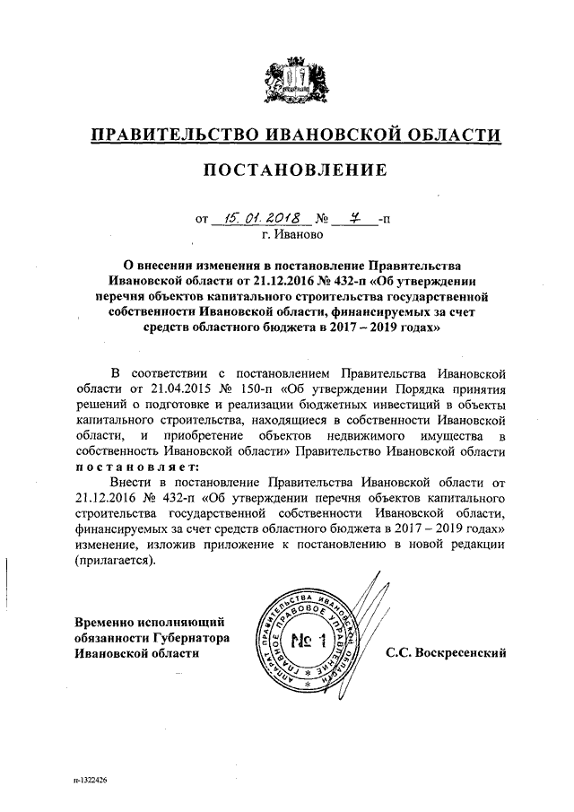 Постановление Правительства Ивановской области от 15.01.2018 N 7-п "О внесении изменения в постановление Правительства Ивановской области от 21.12.2016 N 432-п "Об утверждении перечня объектов капитального строительства государственной собственности Ивановской области, финансируемых за счет средств областного бюджета в 2017 - 2019 годах"