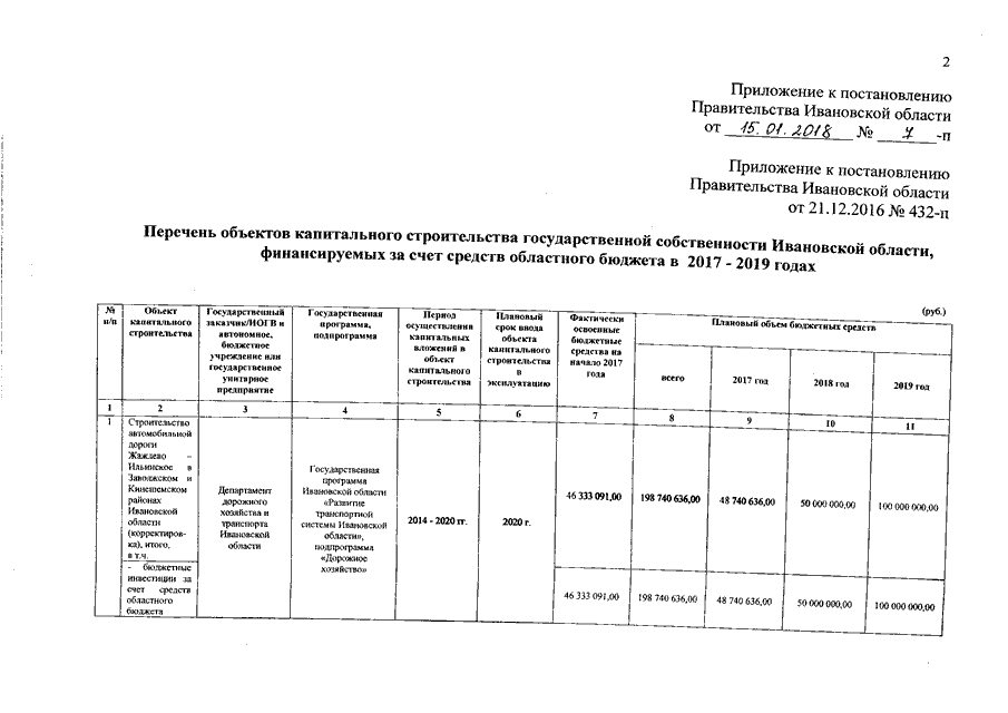 Постановление Правительства Ивановской области от 15.01.2018 N 7-п "О внесении изменения в постановление Правительства Ивановской области от 21.12.2016 N 432-п "Об утверждении перечня объектов капитального строительства государственной собственности Ивановской области, финансируемых за счет средств областного бюджета в 2017 - 2019 годах"