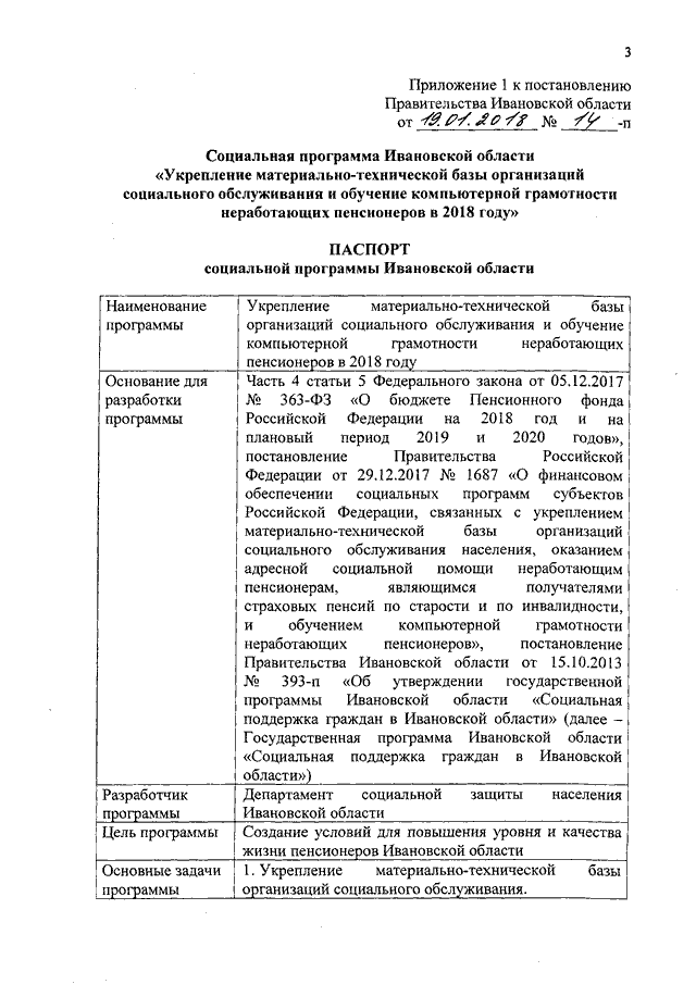 Постановление Правительства Ивановской области от 19.01.2018 N 14-п "Об утверждении социальной программы Ивановской области "Укрепление материально-технической базы организаций социального обслуживания и обучение компьютерной грамотности неработающих пенсионеров в 2018 году" и Порядка формирования обучения компьютерной грамотности неработающих пенсионеров"