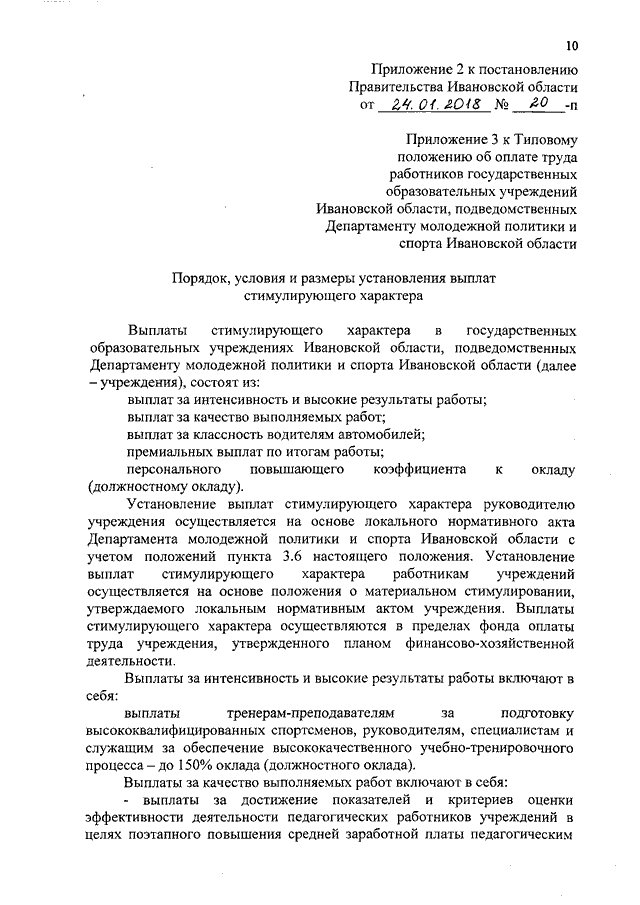 Постановление Правительства Ивановской области от 24.01.2018 N 20-п "О внесении изменений в постановление Правительства Ивановской области от 31.12.2008 N 378-п "О системе оплаты труда работников государственных образовательных учреждений Ивановской области, подведомственных Департаменту спорта и туризма Ивановской области" (вместе с "Порядком, условиями и размерами установления выплат стимулирующего характера")