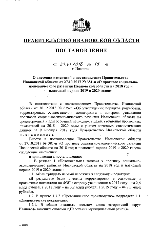 Постановление Правительства Ивановской области от 24.01.2018 N 19-п "О внесении изменений в постановление Правительства Ивановской области от 27.10.2017 N 381-п "О прогнозе социально-экономического развития Ивановской области на 2018 год и плановый период 2019 и 2020 годов"