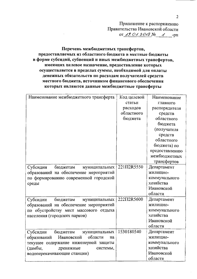 Распоряжение Правительства Ивановской области от 19.01.2018 N 1-рп "Об утверждении перечня межбюджетных трансфертов, предоставляемых из областного бюджета в местные бюджеты в форме субсидий, субвенций и иных межбюджетных трансфертов, имеющих целевое назначение, предоставление которых осуществляется в пределах суммы, необходимой для оплаты денежных обязательств по расходам получателей средств местного бюджета, источником финансового обеспечения которых являются данные межбюджетные трансферты"