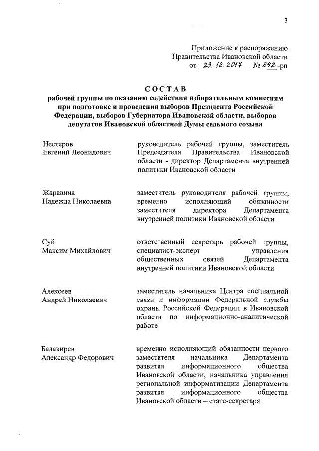 Распоряжение Правительства Ивановской области от 29.12.2017 N 242-рп "О создании рабочей группы по оказанию содействия избирательным комиссиям при подготовке и проведении выборов Президента Российской Федерации, выборов Губернатора Ивановской области, выборов депутатов Ивановской областной Думы седьмого созыва"