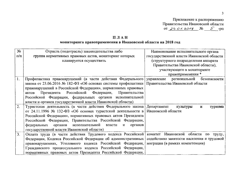 Распоряжение Правительства Ивановской области от 24.01.2018 N 5-рп "О некоторых мерах по организации мониторинга правоприменения в Ивановской области" (вместе с "Планом мониторинга правоприменения в Ивановской области на 2018 год")
