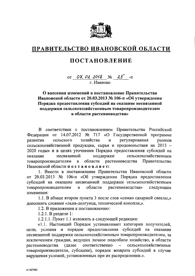 Постановление Правительства Ивановской области от 07.02.2018 N 25-п "О внесении изменений в постановление Правительства Ивановской области от 20.03.2013 N 106-п "Об утверждении Порядка предоставления субсидий на оказание несвязанной поддержки сельскохозяйственным товаропроизводителям в области растениеводства"