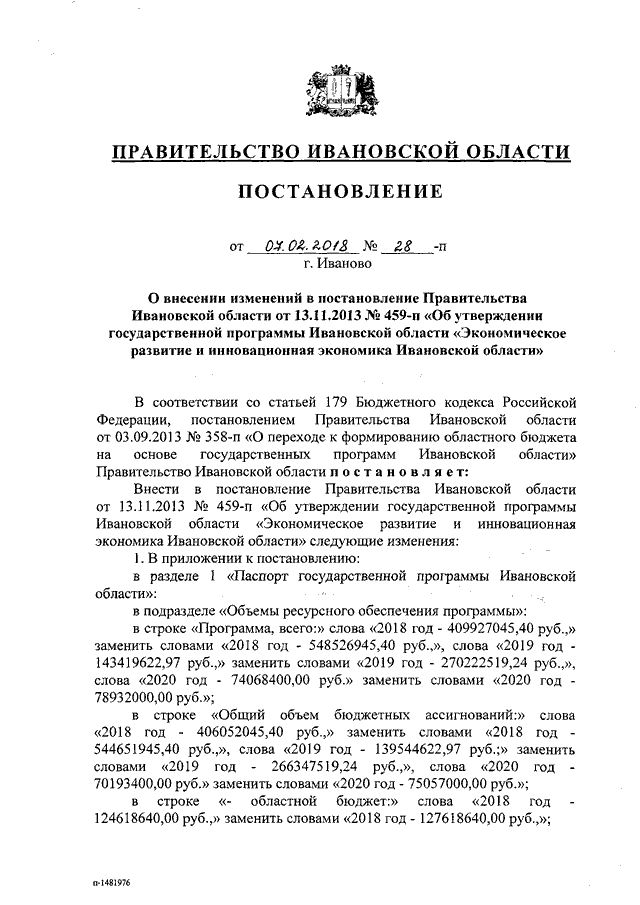 Постановление Правительства Ивановской области от 07.02.2018 N 28-п "О внесении изменений в постановление Правительства Ивановской области от 13.11.2013 N 459-п "Об утверждении государственной программы Ивановской области "Экономическое развитие и инновационная экономика Ивановской области"