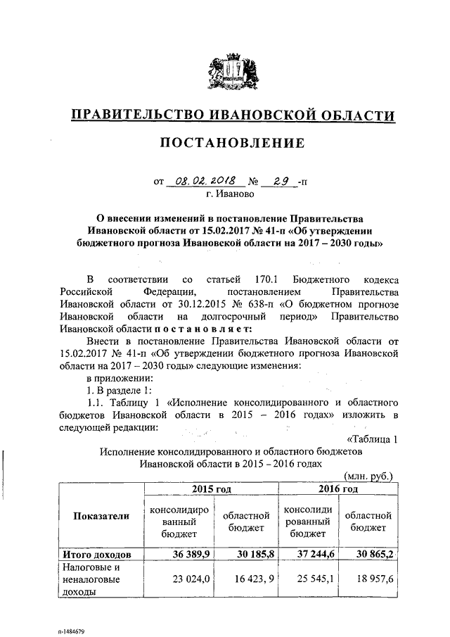 Постановление Правительства Ивановской области от 08.02.2018 N 29-п "О внесении изменений в постановление Правительства Ивановской области от 15.02.2017 N 41-п "Об утверждении бюджетного прогноза Ивановской области на 2017 - 2030 годы"