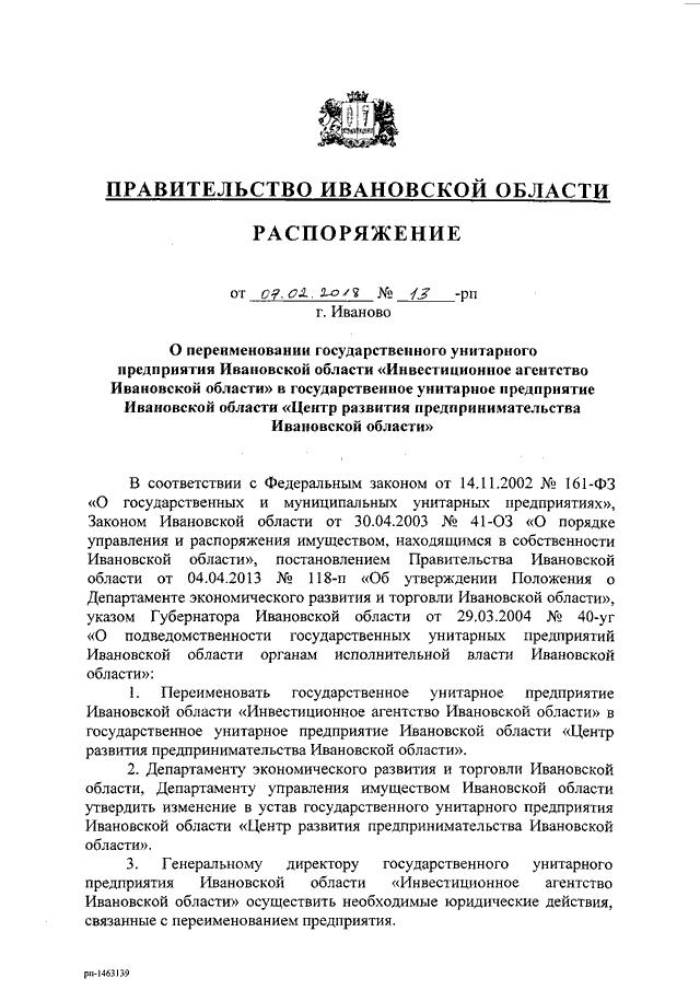 Распоряжение Правительства Ивановской области от 07.02.2018 N 13-рп "О переименовании государственного унитарного предприятия Ивановской области "Инвестиционное агентство Ивановской области" в государственное унитарное предприятие Ивановской области "Центр развития предпринимательства Ивановской области"