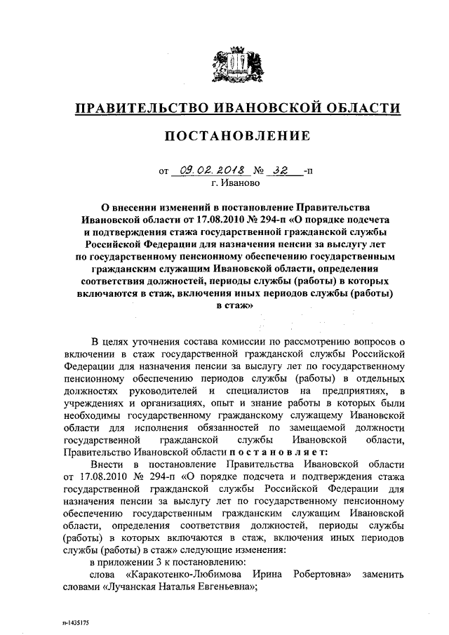 Постановление Правительства Ивановской области от 09.02.2018 N 32-п "О внесении изменений в постановление Правительства Ивановской области от 17.08.2010 N 294-п "О порядке подсчета и подтверждения стажа государственной гражданской службы Российской Федерации для назначения пенсии за выслугу лет по государственному пенсионному обеспечению государственным гражданским служащим Ивановской области, определения соответствия должностей, периоды службы (работы) в которых включаются в стаж, включения иных периодов службы (работы) в стаж"