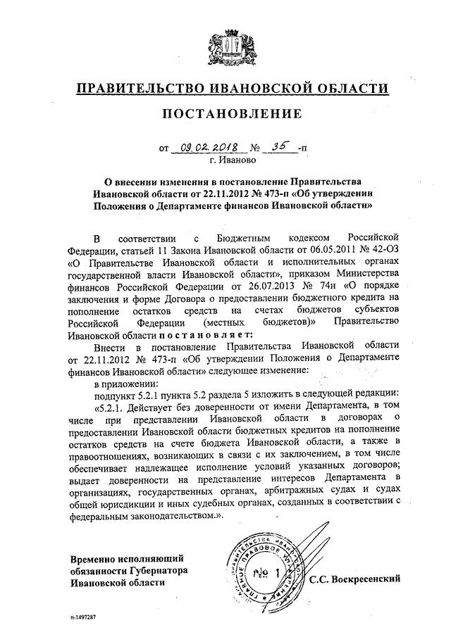 Постановление Правительства Ивановской области от 09.02.2018 N 35-п "О внесении изменения в постановление Правительства Ивановской области от 22.11.2012 N 473-п "Об утверждении Положения о Департаменте финансов Ивановской области"