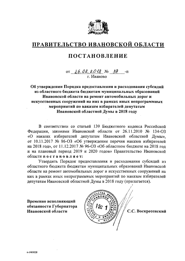 Постановление Правительства Ивановской области от 26.02.2018 N 39-п "Об утверждении Порядка предоставления и расходования субсидий из областного бюджета бюджетам муниципальных образований Ивановской области на ремонт автомобильных дорог и искусственных сооружений на них в рамках иных непрограммных мероприятий по наказам избирателей депутатам Ивановской областной Думы в 2018 году"