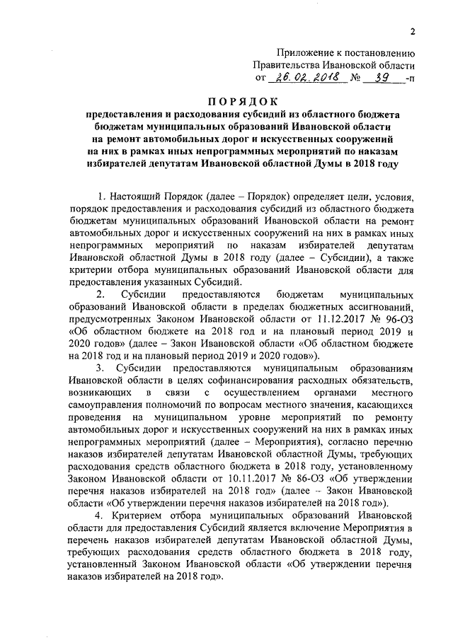 Постановление Правительства Ивановской области от 26.02.2018 N 39-п "Об утверждении Порядка предоставления и расходования субсидий из областного бюджета бюджетам муниципальных образований Ивановской области на ремонт автомобильных дорог и искусственных сооружений на них в рамках иных непрограммных мероприятий по наказам избирателей депутатам Ивановской областной Думы в 2018 году"