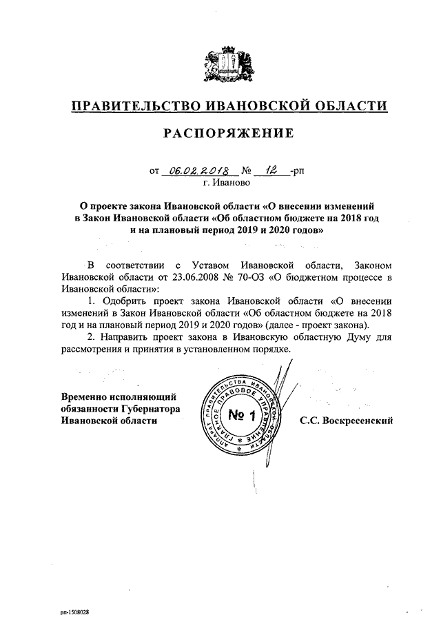 Распоряжение Правительства Ивановской области от 06.02.2018 N 12-рп "О проекте закона Ивановской области "О внесении изменений в Закон Ивановской области "Об областном бюджете на 2018 год и на плановый период 2019 и 2020 годов"