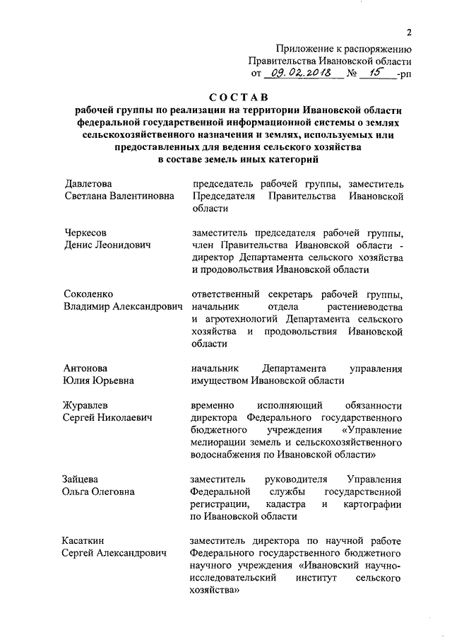 Распоряжение Правительства Ивановской области от 09.02.2018 N 15-рп "О создании рабочей группы по реализации на территории Ивановской области федеральной государственной информационной системы о землях сельскохозяйственного назначения и землях, используемых или предоставленных для ведения сельского хозяйства в составе земель иных категорий"