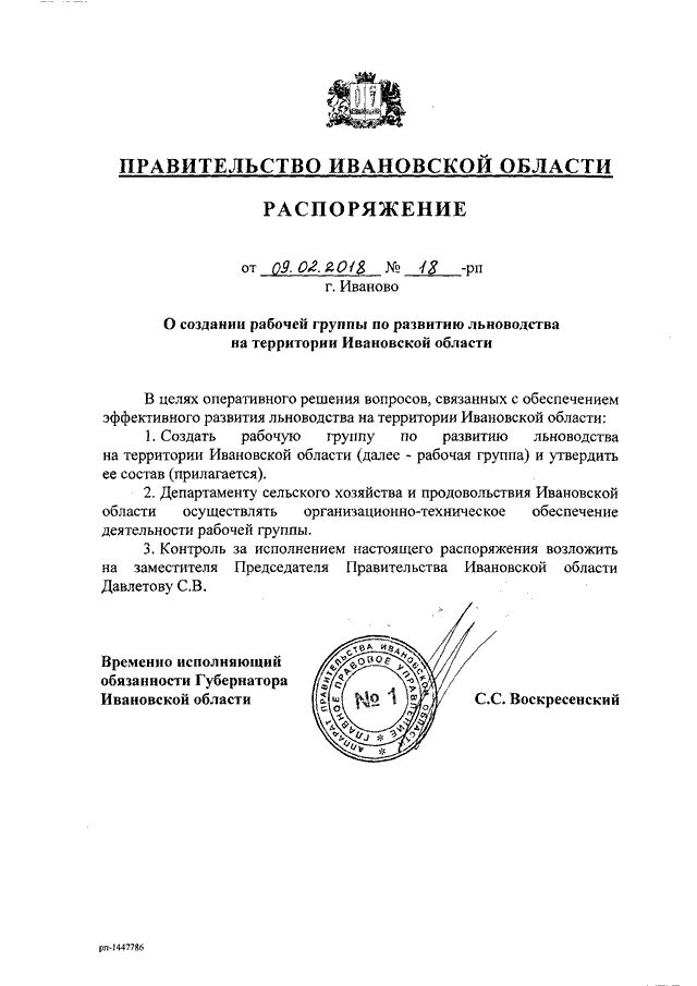 Распоряжение Правительства Ивановской области от 09.02.2018 N 18-рп "О создании рабочей группы по развитию льноводства на территории Ивановской области"