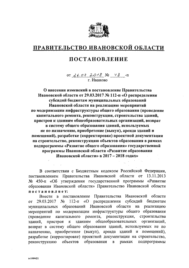 Постановление Правительства Ивановской области от 26.02.2018 N 48-п "О внесении изменений в постановление Правительства Ивановской области от 29.03.2017 N 112-п "О распределении субсидий бюджетам муниципальных образований Ивановской области на реализацию мероприятий по модернизации инфраструктуры общего образования (проведение капитального ремонта, реконструкции, строительства зданий, пристроя к зданиям общеобразовательных организаций, возврат в систему общего образования зданий, используемых не по назначению, приобретение (выкуп), аренда зданий и помещений), разработке (корректировке) проектной документации на строительство, реконструкцию объектов образования в рамках подпрограммы "Развитие общего образования" государственной программы Ивановской области "Развитие образования Ивановской области" в 2017 - 2018 годах"