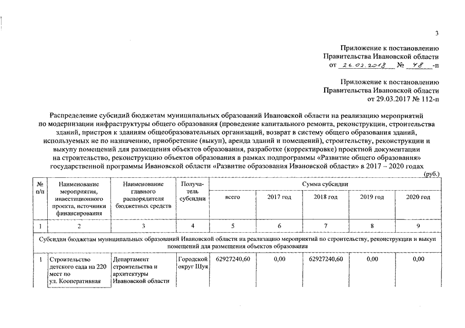 Постановление Правительства Ивановской области от 26.02.2018 N 48-п "О внесении изменений в постановление Правительства Ивановской области от 29.03.2017 N 112-п "О распределении субсидий бюджетам муниципальных образований Ивановской области на реализацию мероприятий по модернизации инфраструктуры общего образования (проведение капитального ремонта, реконструкции, строительства зданий, пристроя к зданиям общеобразовательных организаций, возврат в систему общего образования зданий, используемых не по назначению, приобретение (выкуп), аренда зданий и помещений), разработке (корректировке) проектной документации на строительство, реконструкцию объектов образования в рамках подпрограммы "Развитие общего образования" государственной программы Ивановской области "Развитие образования Ивановской области" в 2017 - 2018 годах"