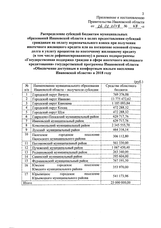 Постановление Правительства Ивановской области от 26.02.2018 N 47-п "О распределении субсидий бюджетам муниципальных образований Ивановской области в целях предоставления субсидий гражданам на оплату первоначального взноса при получении ипотечного жилищного кредита или на погашение основной суммы долга и уплату процентов по ипотечному жилищному кредиту (в том числе рефинансированному) в рамках подпрограммы "Государственная поддержка граждан в сфере ипотечного жилищного кредитования" государственной программы Ивановской области "Обеспечение доступным и комфортным жильем населения Ивановской области" в 2018 году"
