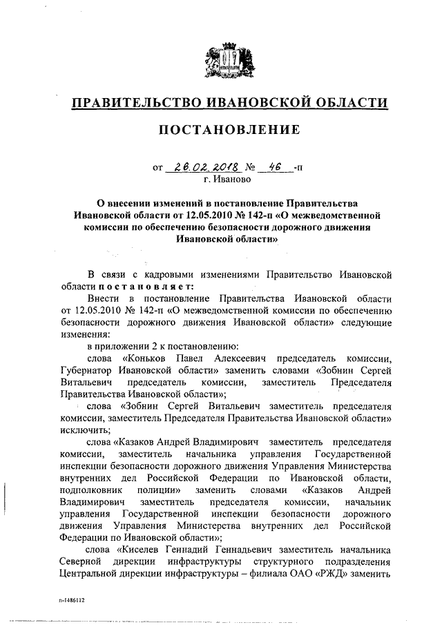 Постановление Правительства Ивановской области от 26.02.2018 N 46-п "О внесении изменений в постановление Правительства Ивановской области от 12.05.2010 N 142-п "О межведомственной комиссии по обеспечению безопасности дорожного движения Ивановской области"