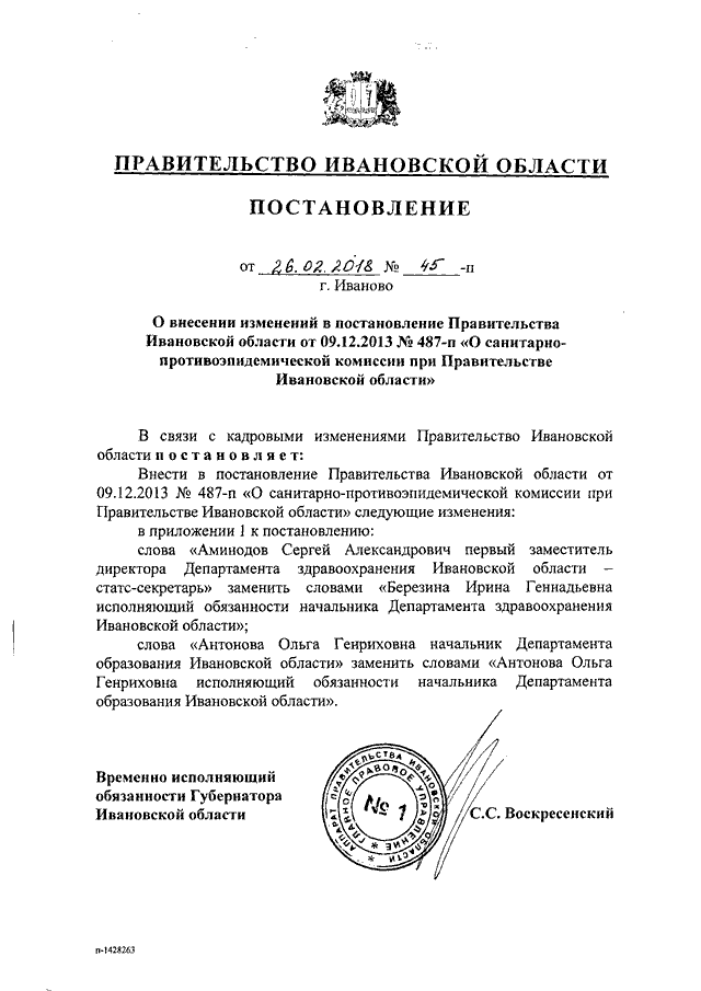 Постановление Правительства Ивановской области от 26.02.2018 N 45-п "О внесении изменений в постановление Правительства Ивановской области от 09.12.2013 N 487-п "О санитарно-противоэпидемической комиссии при Правительстве Ивановской области"