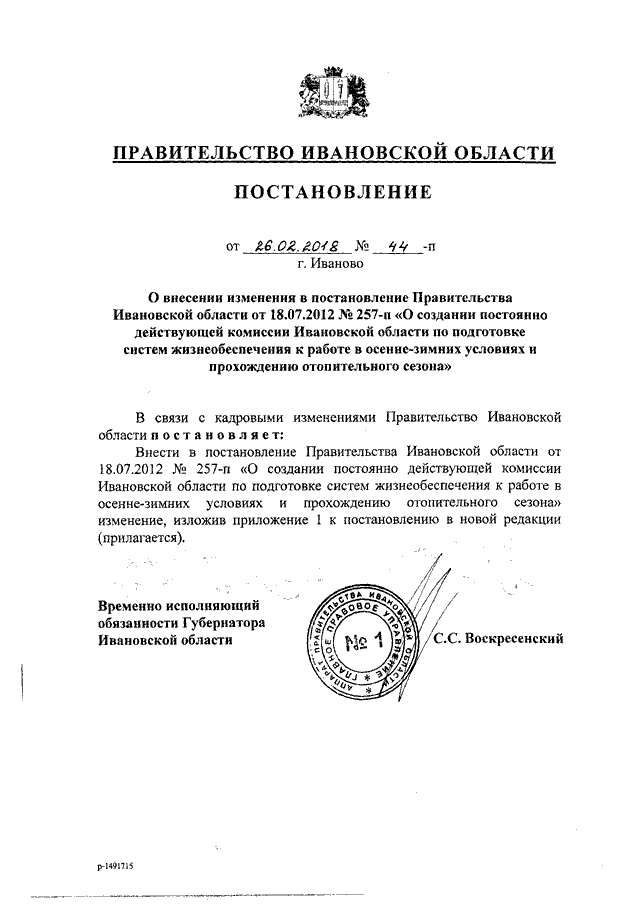 Постановление Правительства Ивановской области от 26.02.2018 N 44-п "О внесении изменения в постановление Правительства Ивановской области от 18.07.2012 N 257-п "О создании постоянно действующей комиссии Ивановской области по подготовке систем жизнеобеспечения к работе в осенне-зимних условиях и прохождению отопительного сезона"